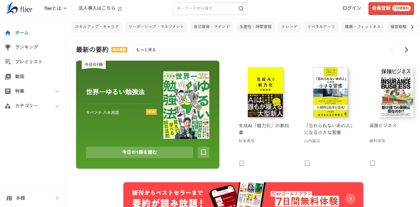flier(フライヤー)は、ビジネス書・実用書・教養書を中心に、1冊約10分で読める要約を提供する読書支援サービスだ。