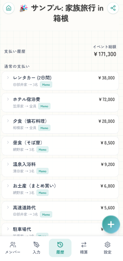 この機能があることで、単なる「立替精算」より一段深い運用に対応できる。飲み会や食事会より、むしろ家族旅行・ゼミ合宿・部活遠征・複数世帯のレジャーのように、お金の流れが複雑になりやすいシーンで真価を発揮するタイプのWebサービスだと言えるだろう。